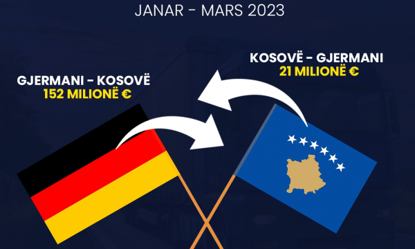 Sipas këtyre të dhënave, eksporti drejt Gjermanisë në periudhën Janar-Mars 2023 ka arritur vlerën e rreth 21 milionë eurove, që ka pjesëmarrje prej 9.8% në eksportin e përgjithshëm të vendit.