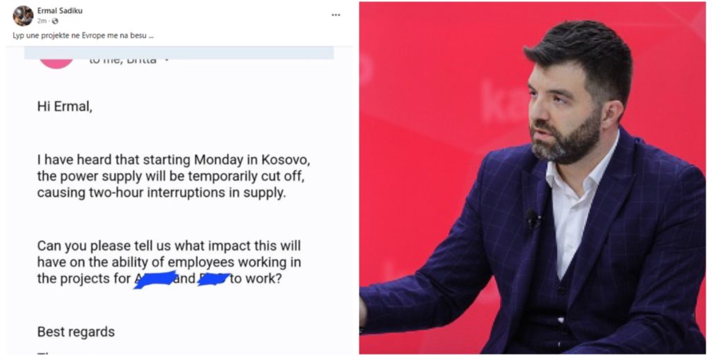 Inxhinieri i teknologjisë, Ermal Sadiku, ka publikuar një email komunikimi me kompani në Evropë, të cilët i kanë kërkuar informata për ndikimin që ka në operim të kompanisë reduktimet e rrymës.