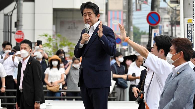 NARA, JAPAN - JULY 08: Former Prime Minister Shinzo Abe makes a street speech before being shot in front of Yamatosaidaiji Station on July 8, 2022 in Nara, Japan. Abe is shot while making a street speech for upcoming Upper House election. (Photo by The Asahi Shimbun via Getty Images)