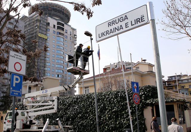 Rruga po ashtu u zbukuruar me flamuj të Ukrainës dhe me ngjyrat verdhë e blu të vizatuara në trotuarë. Në të njëjtën kohë sheshi “Tre vëllezërit Frashëri” që ndodhet mes Bulevardit “Dëshmorët e Kombit” dhe rrugës “Ukraina e Lirë”, u kthye në një pikë protestash kundër luftës.