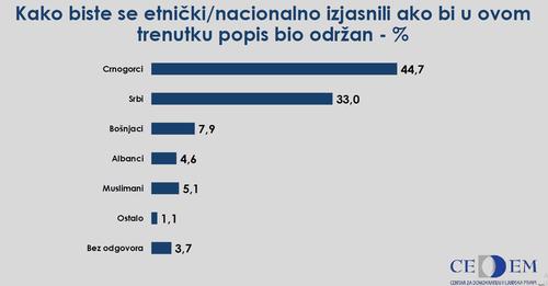 Në rast se regjistrimi i popullsisë do të mbahej tani, anketimi i Qendrës për demokraci dhe të drejtat e njeriut (CEDEM), tregon se 44.7% do të deklaroheshin si malazez, 33% si serb, 7.9% si boshnjakë, 5.1% si muslimanë, 4.6% si shqiptarë, dhe 1.1% si nacionalite të tjera.