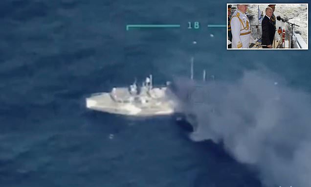 Në videon e publikuar nga ushtria e Ukrainës pretendohet se droni Bayraktar TB2 ka goditur anijen e tipit “Raptor” pranë ishullit të “Gjarpërinjve” duke e shkatërruar atë.