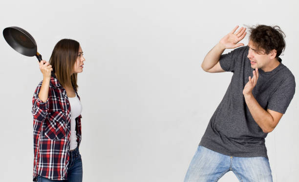 Woman hitting man with cooking pan. Family scene against white background