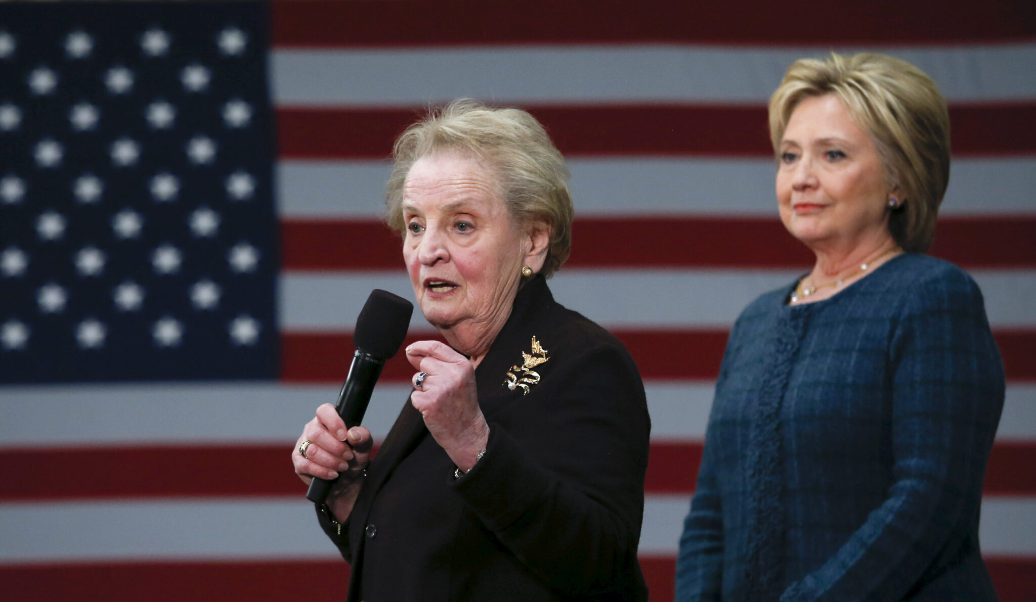 Former U.S. Secretary of State Madeleine Albright (L) introduces Democratic U.S. presidential candidate Hillary Clinton during a campaign stop at Rundlett Middle School in Concord, New Hampshire February 6, 2016. REUTERS/Adrees Latif - RTX25SCX