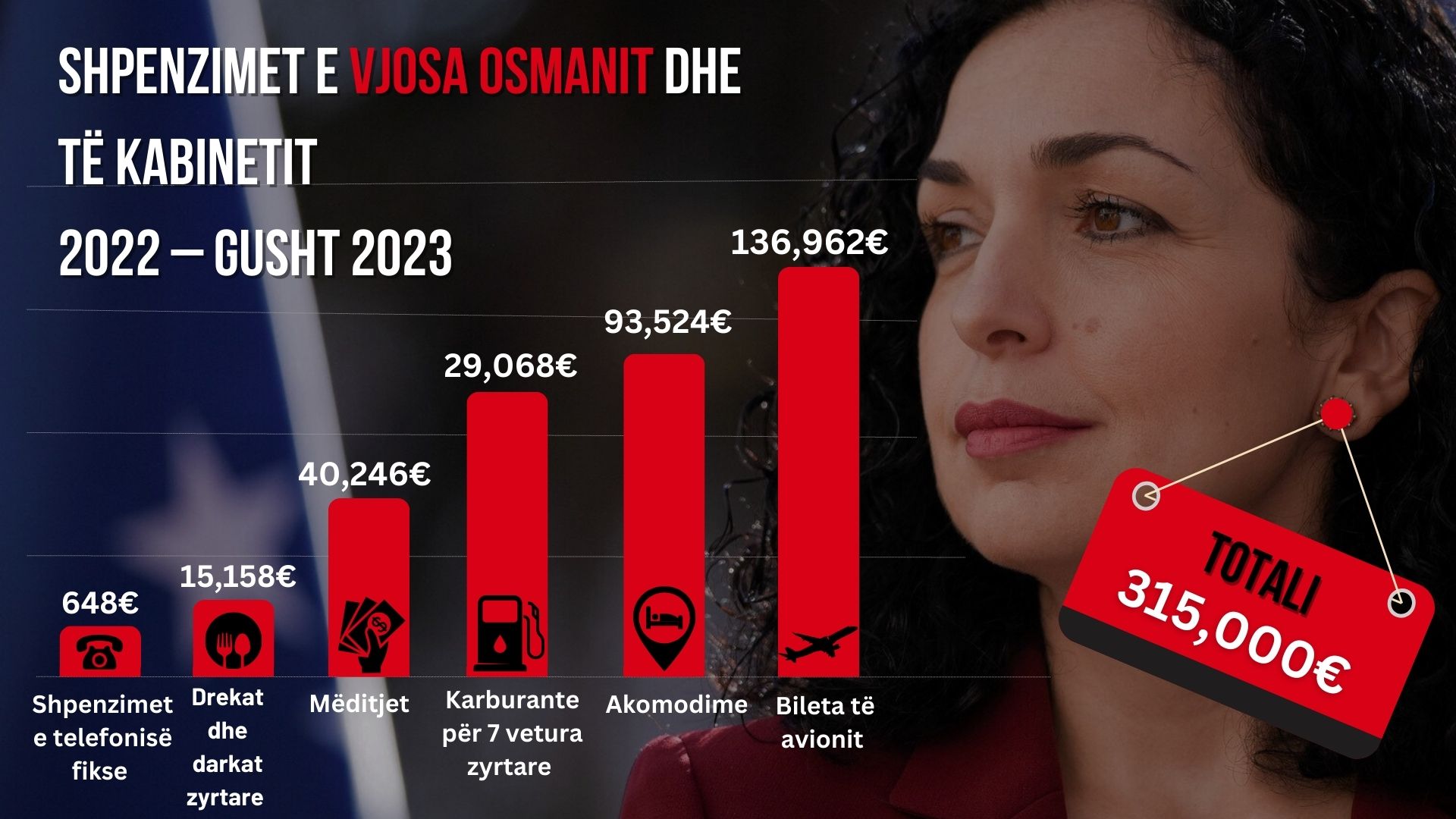 Hiq më pak se 315,606.00 euro i kanë kushtuar buxhetit të shtetit udhëtimet zyrtare, mëditjet, akomodimi, drekat e darkat e presidentes Vjosa Osmani. Shifrat e shpenzimit të buxhetit të shtetit krahasuar me vitin 2021 kur Presidentja dhe gjithë stafi i saj mburreshin në rrjete sociale për ulje të shpenzimeve krahasuar me paraardhësin e saj, ish presidentin, Hashim Thaçi, në 2022 dhe 2023 kanë shënuar rritje marramendëse.