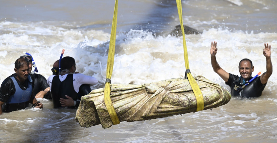 Me kalimin e kohës, tërmetet dhe rritja e nivelit të detit zhytën qytetin dhe Heraklionin. Të enjten, vinçat ngritën statuja nga deti, ndërsa zhytës me kostume që kishin ndihmuar në nxjerrjen e tyre brohoritën nga bregu.
