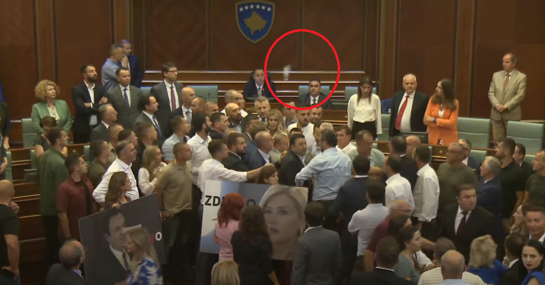 Dikush nga deputetë e opozitës, Time Kadrijaj e Albanë Bytyqi nga AAK e ka gjuajtur me shishe të ujit, e e cila ka përfunduar tek kryekuvendari, Glauk Konjufca. E ky e fundit e ka larguar me dorë.