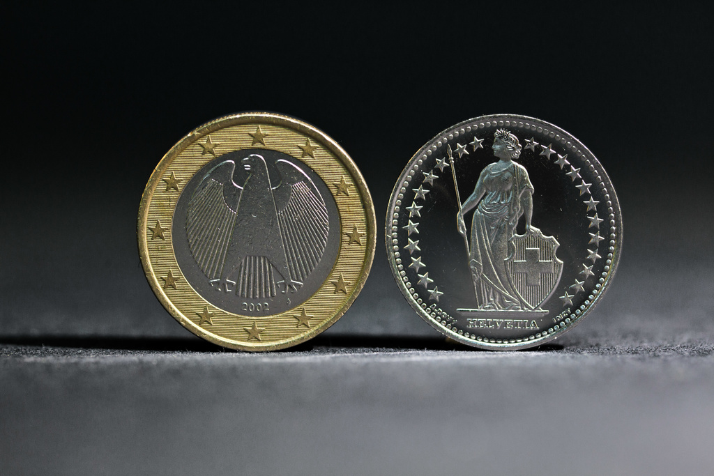 A coin of 1 Euro (left) and a coin of 1 Swiss Franc (right), pictured on July 21, 2011.(KEYSTONE/Martin Ruetschi)