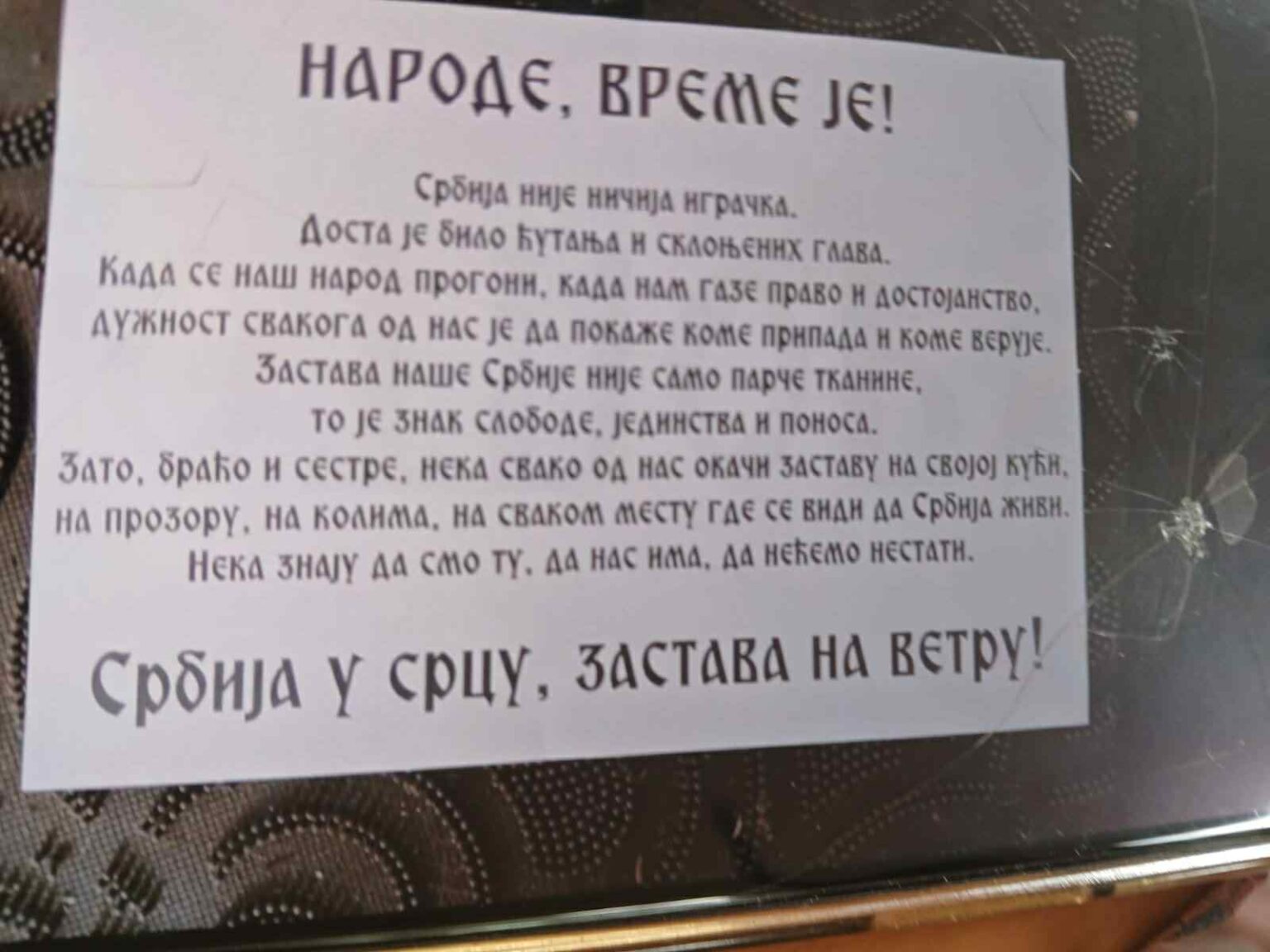 “POPULL, ERDHI KOHA! Serbia nuk është lodër e askujt. Mjaft me heshtjen e kokat ulur. Kur populli ynë dëbohet, kur na shkelen të drejtat e dinjiteti, është detyrë e secilit prej nesh të tregojë besimin e tij. Le ta dinë se jemi këtu, se nuk do të zhdukemi. Serbia në zemër, flamuri në erë!”