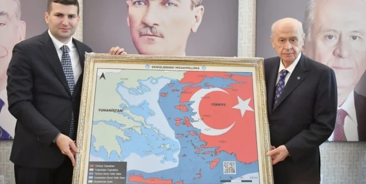 Nga kjo organizatë, Bahceli iu dhurua një hartë që tregon ishujt e Egjeut, madje dhe Kretën, si pjesë të Turqisë.