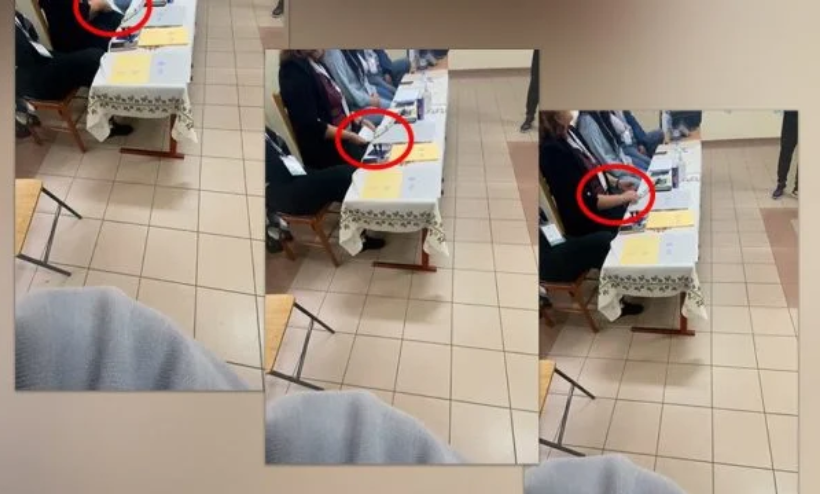 Kryetarja e Komisionit tek qendra e votimit te shkolla Kongresi i Manastirit në Tiranë, është filmuar teksa fsheh disa letra poshtë tavolinës të cilat raportohet se janë fletë votimi.