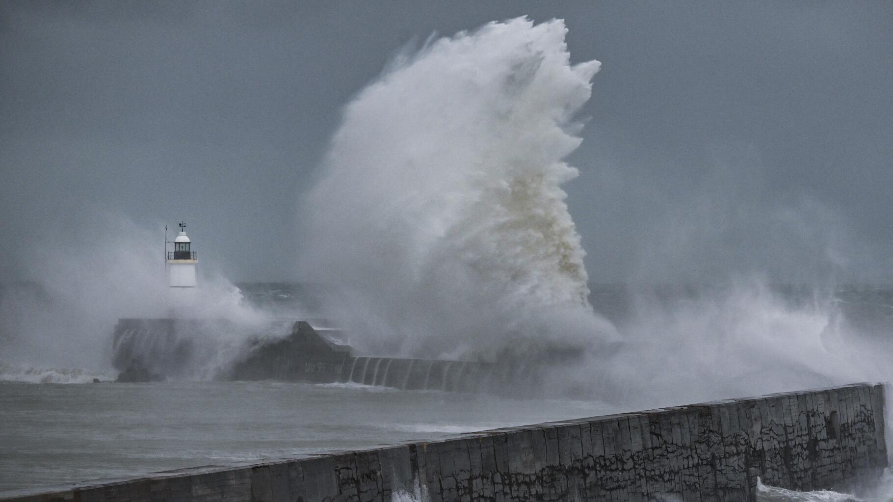 Waves crash over Newhaven Lighthouse and the harbour wall in Newhaven, southern England on November 2, 2023, as strong winds and heavy rain from Storm Ciaran hit Britain. High winds and heavy rain brought by storm Ciaran caused major disruption in southern England on November 2, 2023, with shipping from the port of Dover suspended for several hours and hundreds of schools closed. Winds of up to 100/110 km/h were expected in the morning, and up to 100 km/h in the afternoon, according to the weather forecast on the British government website. (Photo by Glyn KIRK / AFP)