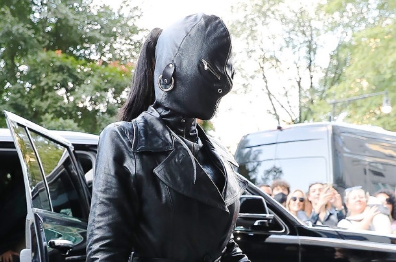 Veshja e Kim Kardashian, e gjitha në lëkurë të zezë, përfshinte çizme me taka, pallto të gjatë dhe mbulim të plotë të fytyrës, derisa i shiheshin vetëm një pjesë e flokëve.