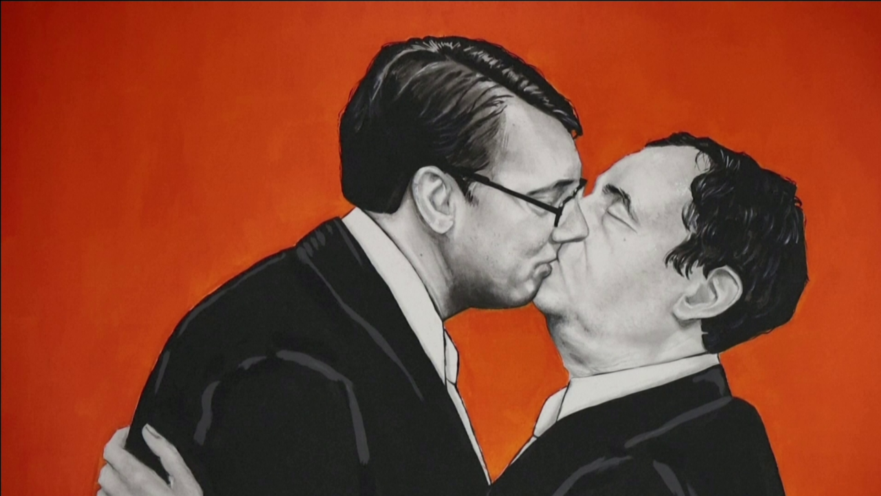 Në takimet e rralla në Bruksel, zor se i kemi parë të shtrëngojnë duart, por në pikturën kontroverse të një artisteje të re nga Prishtina, Kurti dhe Vuçiç puthen në buzë. “Unë linda kur ishte vendosur paqja dhe lufta kishte marrë fund. Pavarësisht se sa të thella janë marrëdhëniet kaotike mes Kosovës dhe Serbisë mendoj se mentaliteti i rinisë dëshiron paqen me shumë se gjithçka”, thotë Emira Murati.