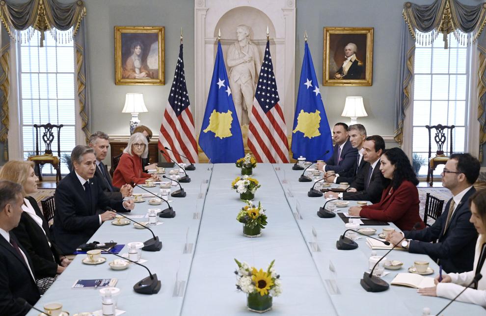 Secretary of State Antony Blinken, third from left, meets with Kosovo President Vjosa Osmani Sadriu, third from right, and Kosovo Prime Minister Albin Kurti, fourth from right, at the State Department in Washington, Tuesday, July 26, 2022. Olivier Douliery - pool, Pool AFP