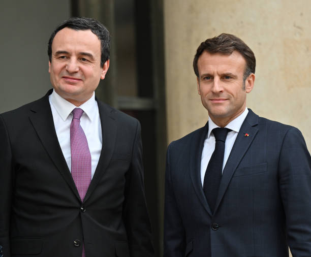 PARIS, FRANCE - NOVEMBER 10: French President Emmanuel Macron (R) welcomes Prime Minister of the Republic of Kosovo Albin Kurti (L) at the Elysee Palace in Paris, France on November 10, 2022. (Photo by Mustafa Yalcin/Anadolu Agency via Getty Images)
