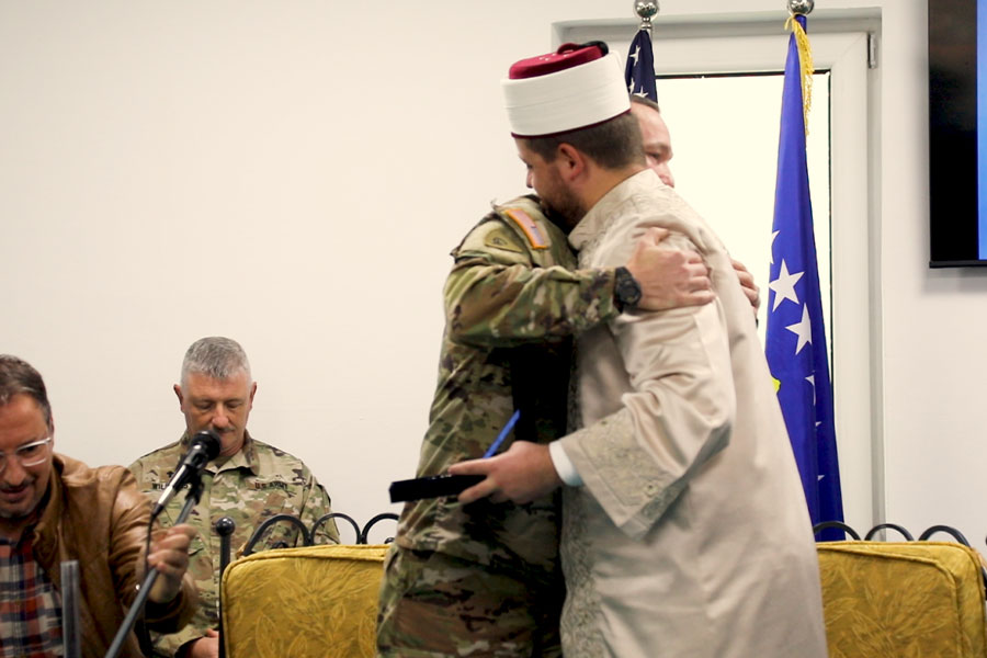 ‘’Ne jemi shumë mirënjohës ndaj SHBA-ve për çdo gjë ata kanë bërë dhe po bëjnë për vendin tonë. Kosova nuk ka aleat partner e mikë se sa SHBA-të, andaj e lus edhe zotin e madhëruar që ti kemi përherë këta miq. Me prezencën e me mbështetjen e tyre sot kemi nderin të kemi mysafir një grup nga kampi amerikan Bonstill. Disa miq tan që i prinë miku im, Kapelani Major Paul Girdley me bashkëpunëtorë të cilëve i falënderojmë shumë për vizitën. Pa dyshim kjo vizitë për neve është ditë historike ditë e veçantë , ditë që do ta mbajmë në mënd gjatë. Miq të tillë pa dyshim se ja shtojmë vlerën shtëpisë ton , vendit tonë dhe natyrisht që xhamia është e hapur për çdo krijesë të zotit’’, tha Imami.