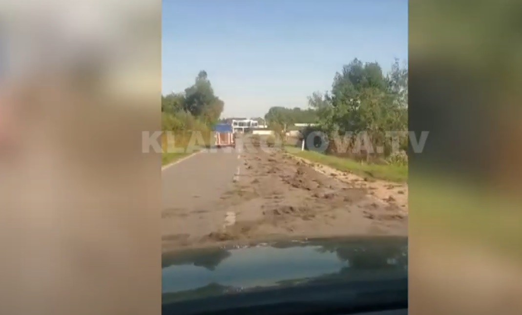 Në pamjet e siguruara nga Klankosova.tv shihet se rreth një kilometër e kësaj rruge është mbushur me baltë nga një makinë për korrjen e misrit që po kalon aty.
