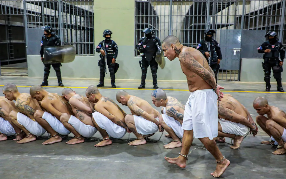 Në një video të postuar nga Bukele, të burgosurit të zhveshur me pantallona të shkurtra të bardha, me kokë të rruar, shihen duke vrapuar nëpër burgun e ri në qeli. Shumë tatuazhe të bandave të arinjve.