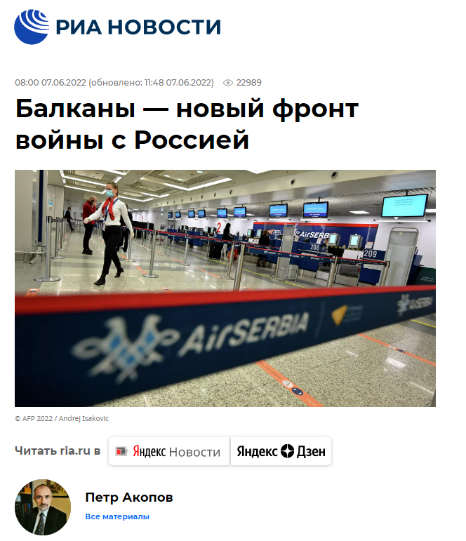 Kështu, në një rubrikë të autorit Petar Akopov, ai shprehet se “situata në Bosnjë, rreth Kosovës (dhe çështjes shqiptare në tërësi, duke përfshirë Maqedoninë dhe Malin e Zi) tregon se kufijtë aktualë janë shumë të kushtëzuar”.
