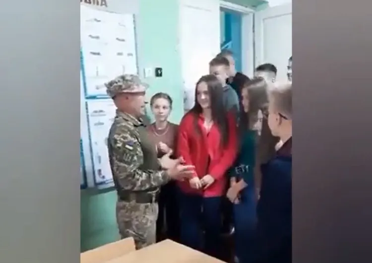 Në një video në rrjetin social Twitter, faqja “UkrArmyBlog”, publikoi të mërkurën pamjet kur mësimdhënësi me uniformë ushtarake, i befasoi nxënësit, duke u futur në klasë ku ata po mbanin mësim.