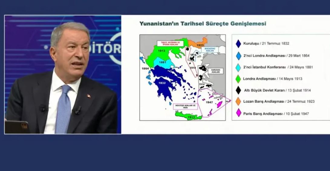 “Akar akuzoi vendin tonë për “ekspansionizëm” ndaj Turqisë, duke iu referuar formësimit të kufirit grek në vitin 1821, deri në vitin 1948”, shkruan më tej media greke, duke shtuar: “Ju me rreth 3000 ishuj në Egje na dilni në hundë dhe më pas e shihni Turqinë si ekspansioniste. Është diçka vërtet e kuptueshme. Kjo është diçka që kërkojmë nga të tre palët ta shohin dhe ta kuptojnë”, tha ministri turk i Mbrojtjes duke paraqitur një hartë të Greqisë me zgjerimin e kufijve sipas periudhave.