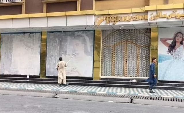 Një burrë është parë të dielën duke lyer me ngjyrë imazhet e modeleve femra në një sallon bukurie në qendër të Kabulit, mes frikës se të drejtat e grave mund të shkelen nga talebanët mizogjinistë.