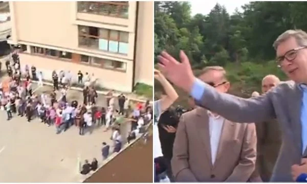 Ishte aty momenti kur Vuçiq po bënte me dorë nga tarraca për një grup njerëzish të mbledhur në parking, por këta të fundit nuk e shohin dhe nuk reagojnë ndaj gjestit të tij.
