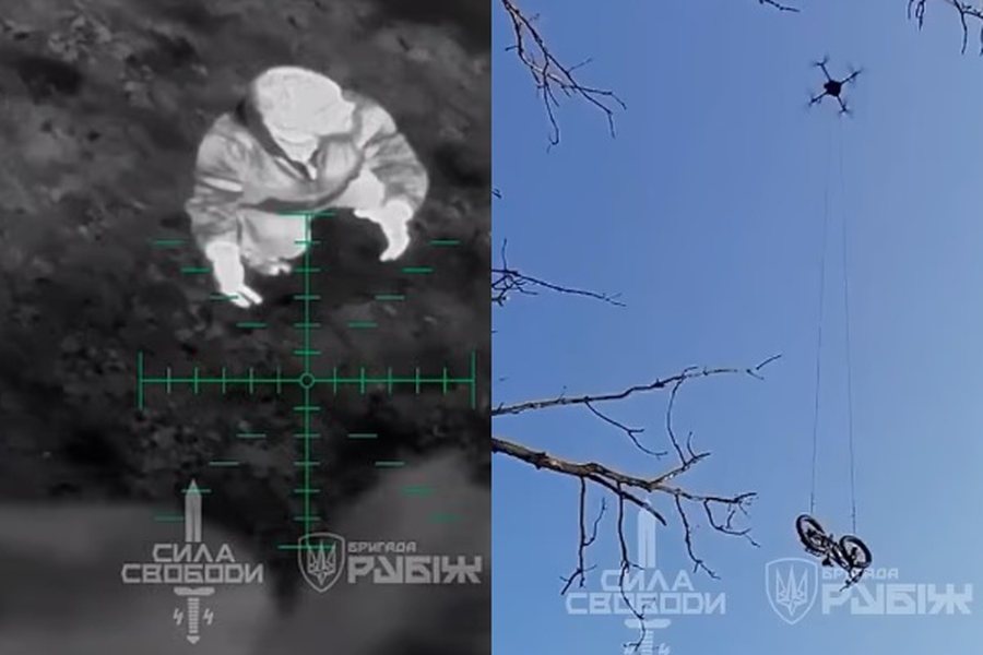 Pamjet e publikuara nga brigada Rubizh e Gardës Kombëtare të Ukrainës tregojnë një dron duke ulur biçikletën elektrike, që peshonte rreth 40 kilogramë, te ushtari i plagosur, i cili më pas shihet duke u larguar me biçikletë nga forcat ruse.