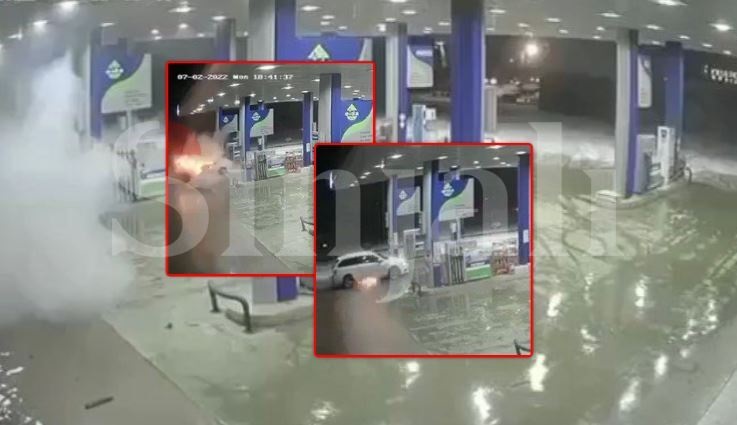 Në pamje shihet se djegia fillon prej poshtë e më pas shpërthen e gjithë vetura, ndërsa edhe xhamat e lokalit thyhen.