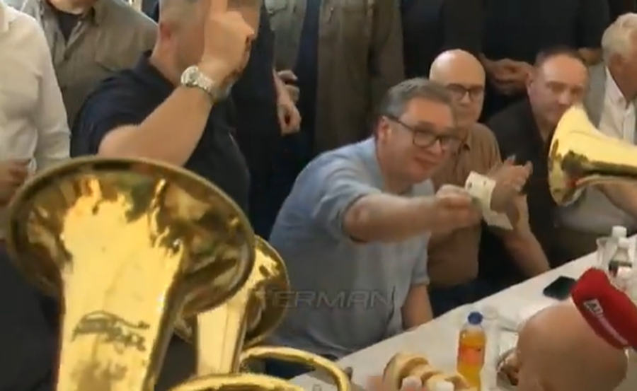 Të ftuarit shijuan vaktin e pasur dhe trombistët, ndërsa në pamjet e publikuara në rrjet shihet Vuçiç, duke u relaksuar me një gotë birrë.