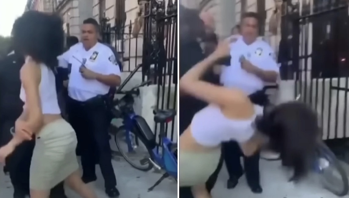 E reja shihet duke debatuar me efektivët e policisë ku njëri prej tyre e largon dhe më pas e godet me grusht duke e plandosur në trotuar.
