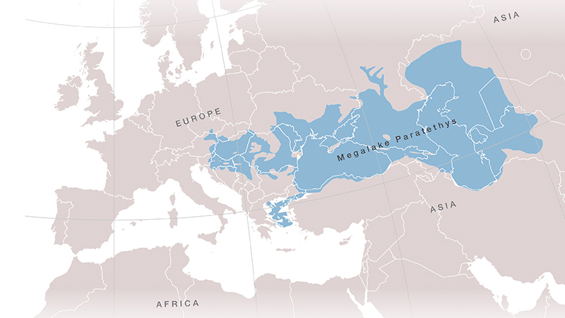 At its largest, the megalake Paratethys (shown superimposed on modern geography) stretched from the eastern Alps to today's Kazakhstan.DAN PALCU; NATURAL EARTH