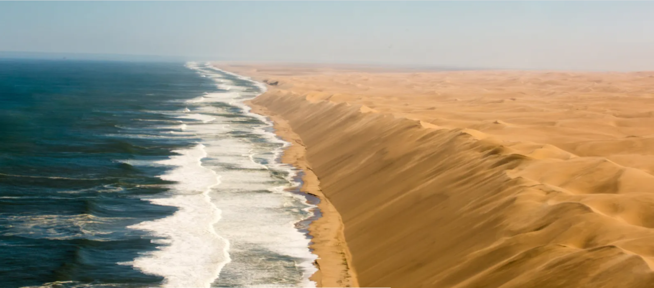 Një nga zonat më të pabesa të shkretëtirës është një hapësirë prej 500 km me duna të larta rëre dhe anije të ndryshkura përgjatë vijës së oqeanit Atlantikut, njohur si “Bregu i skeletit”. E shtrirë nga Angola jugore deri në Namibinë qendrore, zona e ka marrë emrin e saj nga kufomat e shumta të balenave të shpërndara nëpër brigje dhe nga gati 1000 anije të mbytura gjatë shekujve.