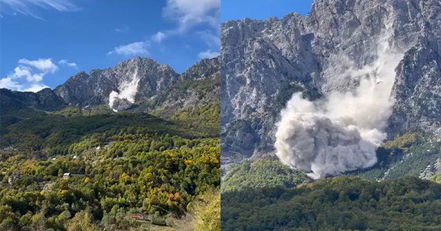 Pamjet e rralla janë filmuar nga një banor i zonës, Lekë Rraskadoli, i cili ka kapur momentin kur një pjesë e madhe e shkëmbit shkëputet dhe bie me zhurmë në terren.