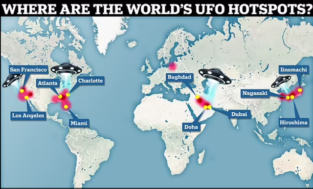 Dokumenti përfshin një hartë që zbulon se ku janë regjistruar më shumë objekte të paidentifikuara, bazuar në raportet midis 1996 dhe 2023. Harta zbulon se zonat me më shumë ufo janë Nagasaki dhe Hiroshima në Japoni, brigjet lindore dhe perëndimore të SHBA, duke përfshirë Kaliforninë dhe pjesë të Lindjes së Mesme.