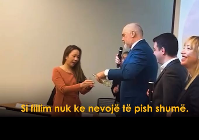 “Në fillim duhet të heqësh maskën. Nuk mund ta provosh me maskë. Kjo sepse nuk kemi gjetur ende një mënyrë për të pirë me maskë. Si fillim nuk ke nevojë të pish shumë. Po të hedh pak. Provoje. E shikon. Është 46% alkool. Do dhe pak? Po ta mbush prap, dhe merre gotën me vete. Prisni pak dhe për tre minuta do telefononi bashkëshortin”, i thotë Rama zyrtares japoneze.