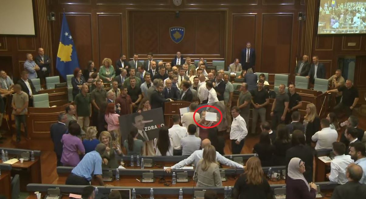 Kujtojmë se pak minuta më parë, në kuvend pati sërish kacafytje mes deputetëve, ku në një moment, Time Kadrijaj e AAK-së, e gjuajti me shishe kryetarin e kuvendit, Glauk Konjufca.