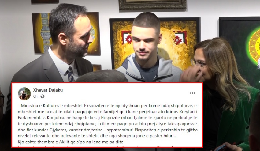 “Ministria e Kulturës e mbeshtet Ekspozitën e të një dyshuari për krime ndaj shqiptarëve, e mbështet me taksat të cilat i pagujajnë vetë familjet që i kanë përjetuar ato krime. Kreytari i Parlamentit, z. Konjufca, në hapje të kësaj Ekspozite mban fjalime të zjarrta në përkrahje të të dyshuarve për krime ndaj shqiptarëve, i cili merr pagë po ashtu prej atyre taksapaguesve dhe flet kundër Gjykatës, kundër drejtësisë – sypatrembur! Ekspoziten e përkrahin të gjitha nivelet relevante dhe irelevante të shtetit dhe nga shoqëria jonë e pastër bilur!…”, shkruan Dajaku në Facebook.