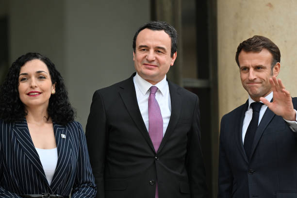 PARIS, FRANCE - NOVEMBER 10: French President Emmanuel Macron (R) welcomes President of Kosovo Vjosa Osmani (L) and Prime Minister of the Republic of Kosovo Albin Kurti (C) at the Elysee Palace in Paris, France on November 10, 2022. (Photo by Mustafa Yalcin/Anadolu Agency via Getty Images)