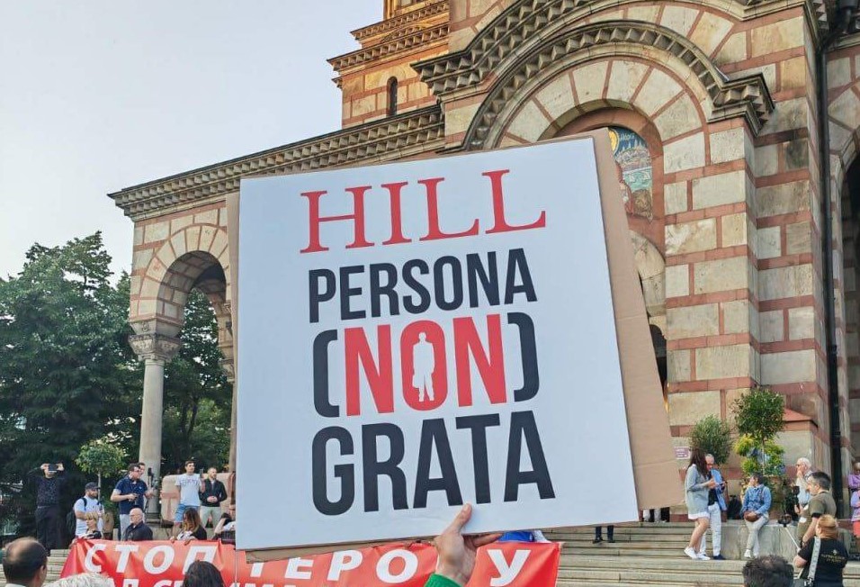 Dhjetëra serbë janë mbledhur të hënën në Beograd në formë proteste ndaj arrestimit të një 50-vjeçari në lidhje me kërcënimet për vrasjen e ambasadorit të Shteteve të Bashkuara (SHBA) në Serbi, Christopher Hill. Në Beograd janë shfaqur edhe mbishkrime kërcënuese ndaj ambasadorit Hill.