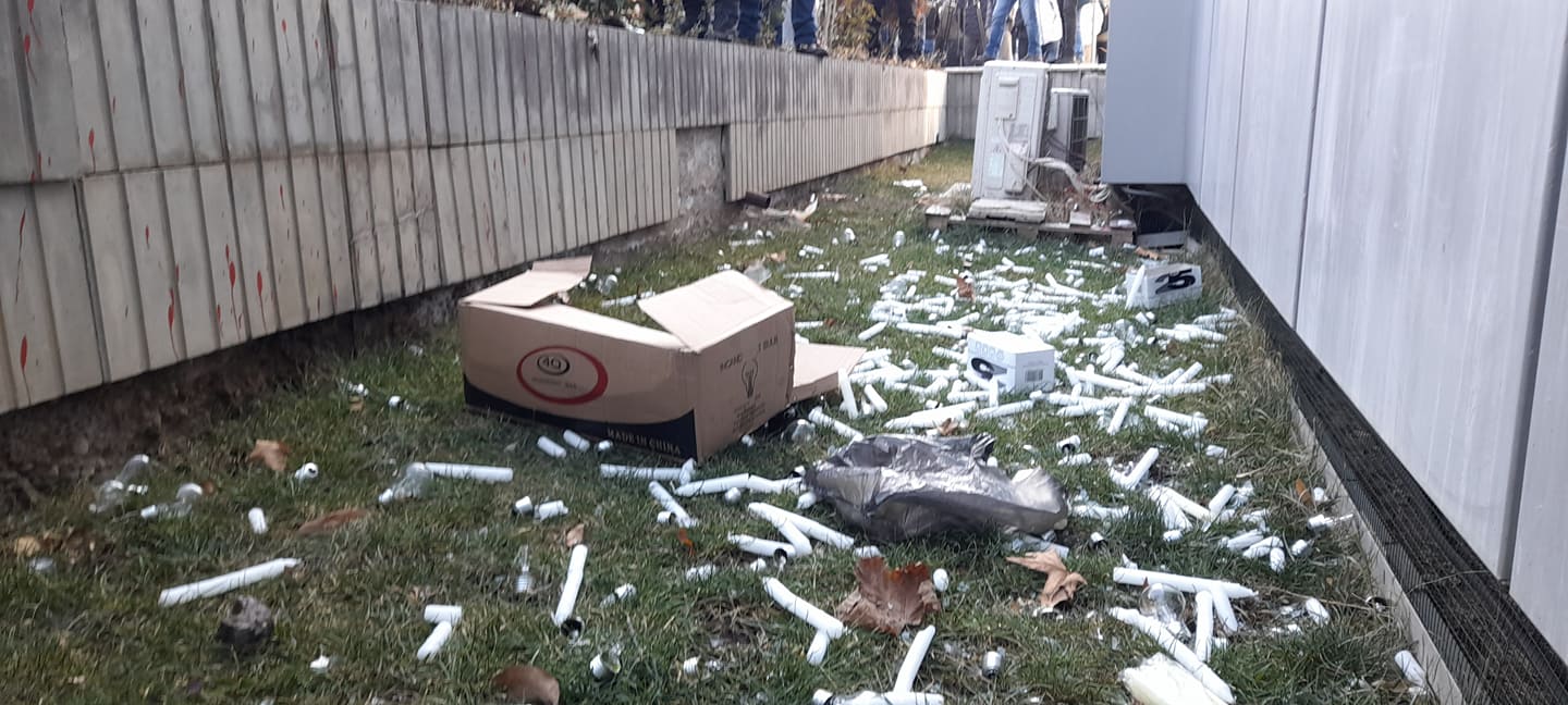 Protestuesit në protestën kundër shtrenjtimit të energjisë elektrike janë duke hedhur poqa elektrik dhe qirinjë në drejtim te objektit të qeverisë së Kosovës