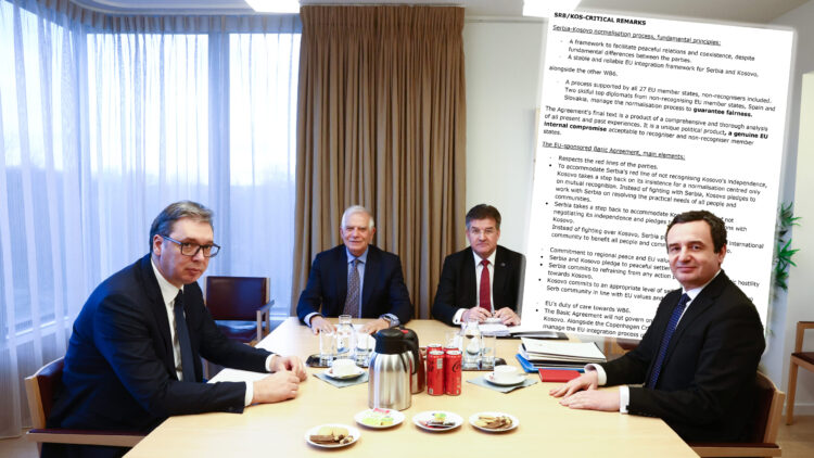 Teksti përfundimtar i Marrëveshjes është produkt i një analize gjithëpërfshirëse dhe të plotë të të gjitha përvojave të tanishme dhe të kaluara. Është një produkt unik politik, një kompromis i vërtetë i brendshëm i Bashkimit Evropian, i pranueshëm për të njohur dhe mosnjohur shtetet anëtare. Elementet kryesore të Marrëveshjes Themelore të sponsorizuar nga BE janë Respektimi i vijave të kuqe të palëve. Për të përshtatur vijën e kuqe të Serbisë për mosnjohjen e pavarësisë së Kosovës, Kosova bën një hap prapa në këmbënguljen e saj për një normalizim të përqendruar vetëm në njohjen reciproke. Në vend që të luftojë me Serbinë, Kosova zotohet të punojë me Serbinë për zgjidhjen e nevojave praktike të të gjithë njerëzve dhe komuniteteve.