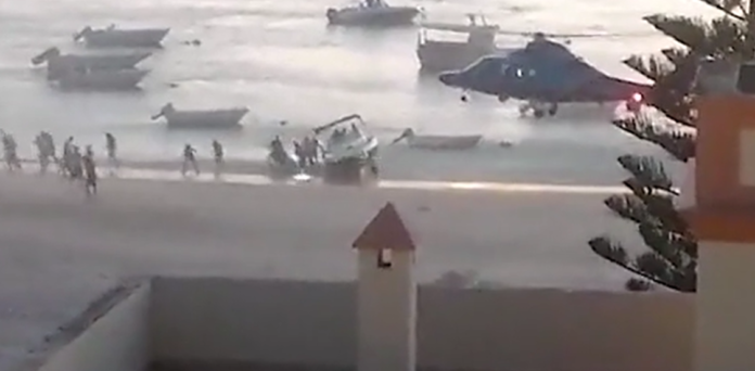 Videoja amatore u filmua në plazhin e Sanlucar de Barrameda në Cadiz, ku turma e pushuesve u afrua me shpejtësi në skafin e braktisur nga trafikantët që po ndiqeshin nga policia në det.
