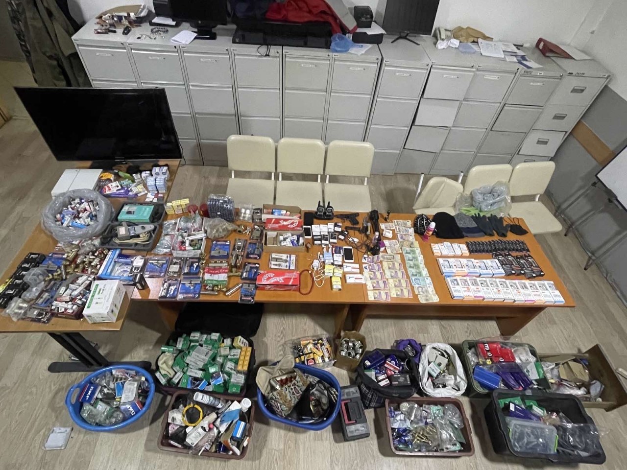 “Gjatë arrestimit tek i dyshuari kryesor F. S. është gjetur një pistolet e llojit Ekol special 99,cal 9 mm dhe 2 fishek kal.7.65mm. Gjatë kontrollit po ashtu janë gjetur dhe konfiskuar shumë sende me vlerë si: cigare të llojeve të ndryshme, TV plazma, Play station, mjete të punës, pjesë të automjeteve, telefona dhe gjëra të tjera të cilat ishin vjedhur në lokacione të ndryshme, ku të njëjtat do të përdoren si prova dhe dëshmi materiale lidhur me veprat e kryera”, thuhet në njoftimin e policisë, transmeton Express.
