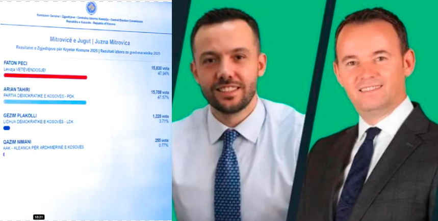 Në Mitrovicë, sipas rezultateve përfundimtare, 122 vota është përpara kandidati i Lëvizjes Vetëvendosje, Faton Peci, ndaj atij të Partisë Demokratike të Kosovës, Arian Tahirit.