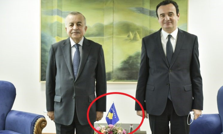 Në atë që e ka dërguar Zyra e Kryeministrit të dy protagonistët shihen në këmbë e në mes tyre në një tavolinë shihet edhe Flamuri i Kosovës.