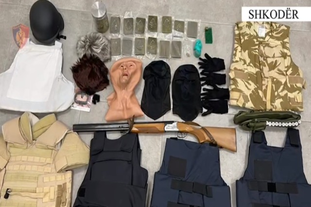 Sipas njoftimit të bluve të Shkodrës, në lagjen “Partizani”, shërbimet e Policisë, ndërhynë në banesën e 26-vjeçarit Rakip Gila, ku kanë gjetur dhe sekuestruar 7 jelekë antiplumb, 2 palë doreza, 3 maska, 2 paruke, municion luftarak, 1 kokore metalike, 1 armë gjahu dhe sende të tjera të kundërligjshme, si dhe sasi lënde të dyshuar narkotike kanabis.
