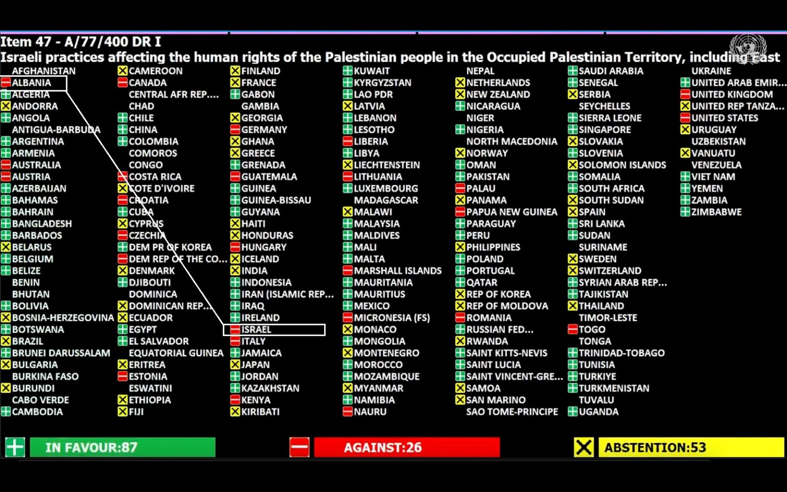 Izraeli, Shqipëria, SHBA, Britania e Madhe, Australia, Austria, Kanadaja, Gjermania dhe Italia votuan kundër rezolutës së së premtes.
