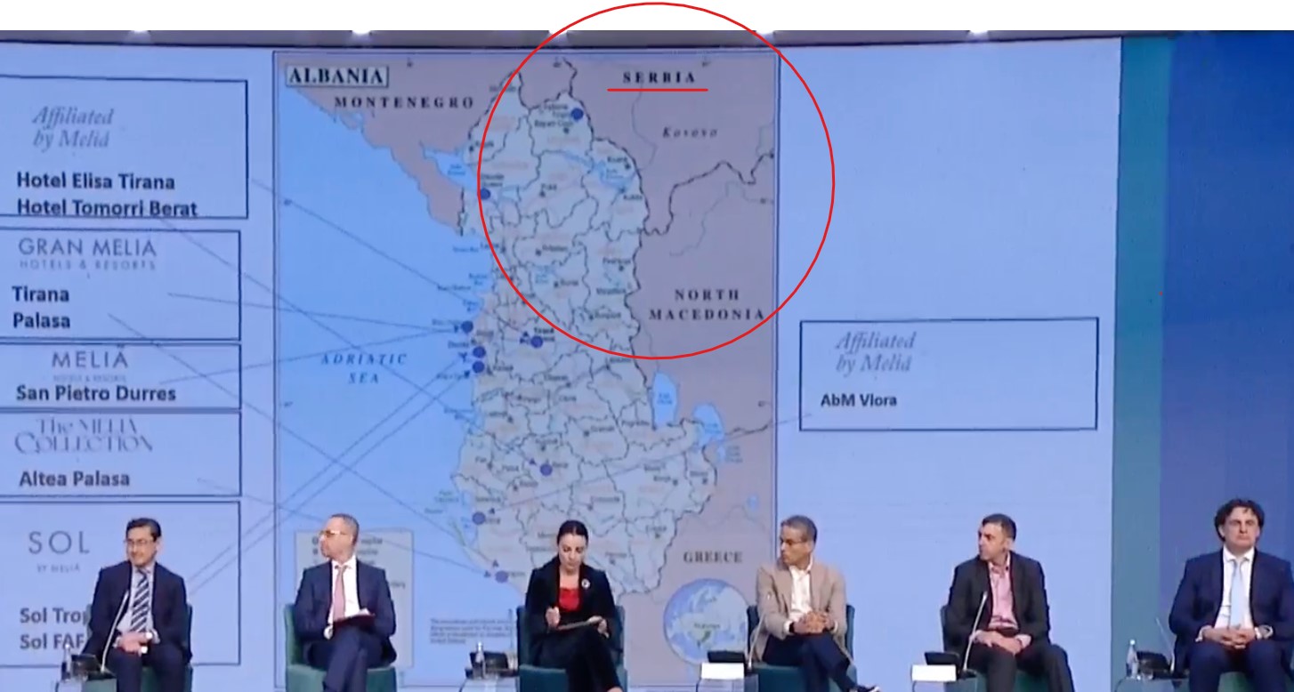 Skandali ka të bëjë me faktin se shteti shqiptar nuk e njeh Kosovën si shtet të pavarur, por si pjesë të Serbisë. Të paktën kështu tregohet në njërën prej hartave të publikuara gjatë fjalës së njërit prej të pranishmëve në panelin, ku merrnin pjesë edhe ministrja e Infrastrujturës Belinda Balluku dhe biznesmeni arab Muhamed Alabbar.